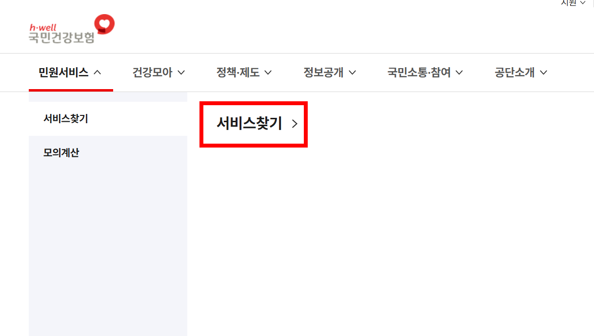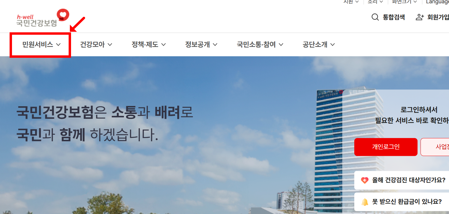 국민건강보험공단 홈페이지 접속 - 민원 메뉴 진입