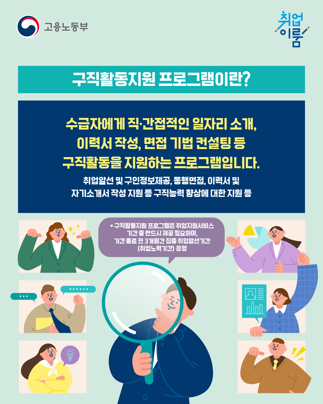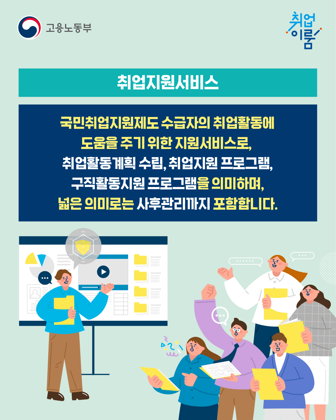 국민취업지원제도는 고용노동부가 운영하는 저소득 구직자 취업 지원 정책입니다. 일정 소득 이하의 국민에게 구직촉진수당, 취업활동 프로그램, 취업성공수당 등을 제공합니다.