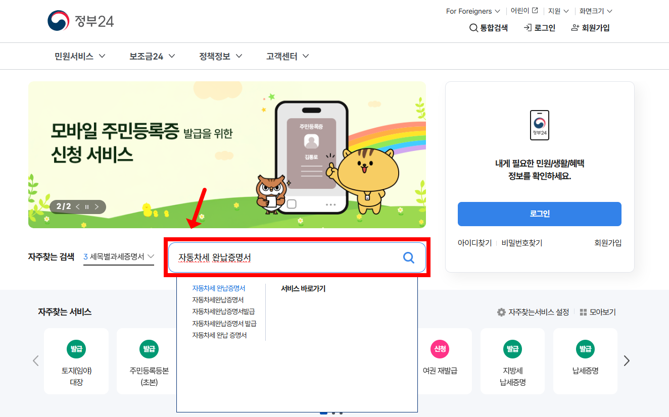- 상단 검색창에 “자동차세 완납증명서” 또는 “지방세 완납증명서” 검색