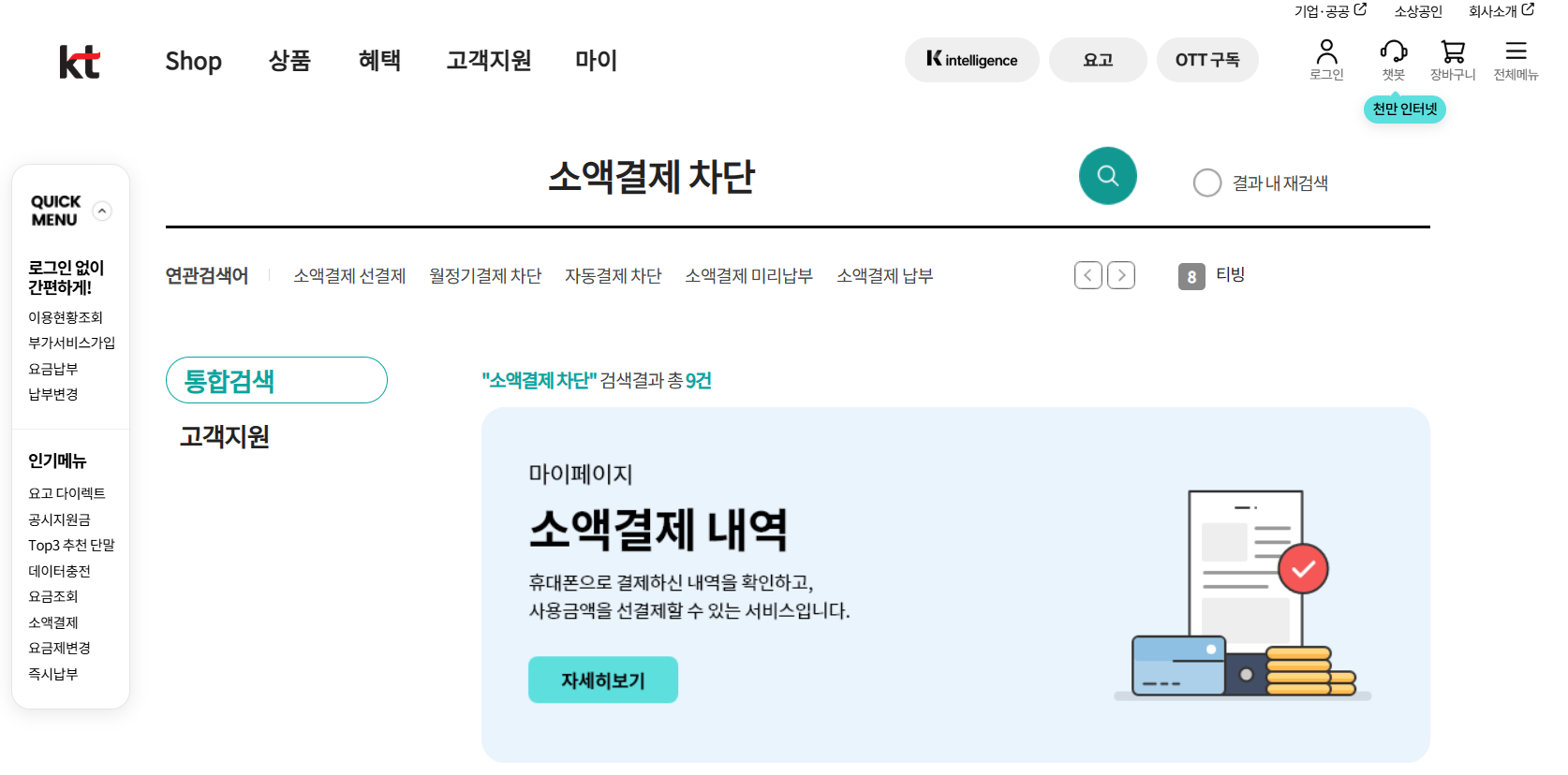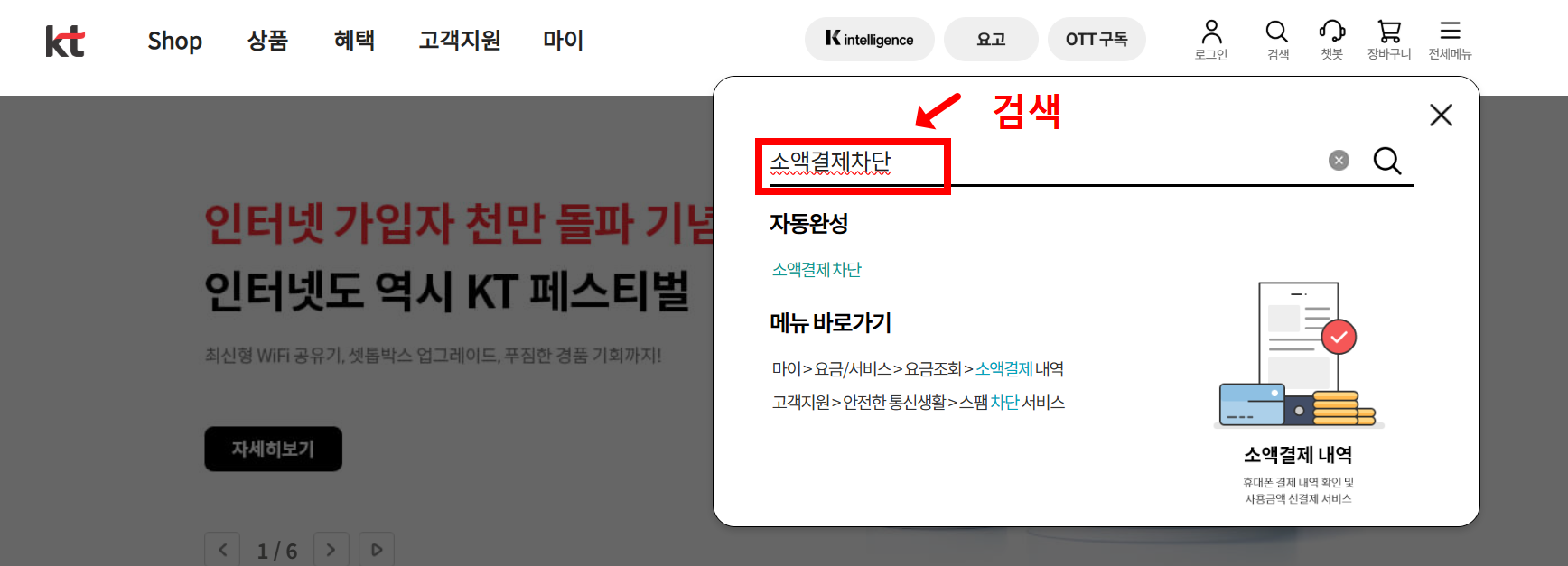 💡 웹에서도 kt.com 접속 > 검색창에 소액결제차단 검색> 소액결제 관리에서 동일하게 차단 가능